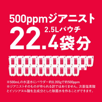 「ジアニスト 除菌消臭パウダー」1つで、水道水で薄めて簡単に「次亜塩素酸(除菌消臭水)を主成分とする除菌水」を作ることができます。